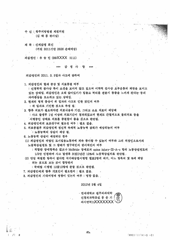| 연세대원주의과대학병원 [요부운동의 제한] 법원신체감정서 | 2012.05.14 |